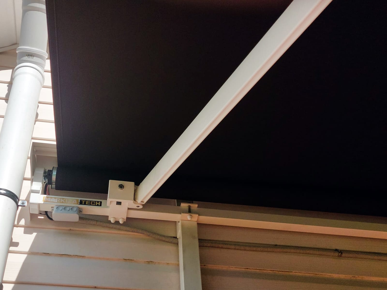 Выполненная работа компанией Маркиза.Тех – изготовление и монтаж локтевой маркизы открытого типа с электроприводом, пультом управления и датчиком ветра в посёлке Ольшаники Ленинградской области осенью 2024 года.